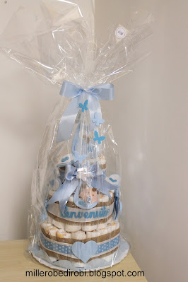 Mi chiedono spesso: ma quanti pannolini ci vanno per una torta? Beh ci sono torte di tutte le dimensioni, per questa ne ho usati 60, due pacchi del numero 2 (3-6 kg). Ma se ne possono fare anche più grandi o più piccole, all'interno si possono mettere le salviette, i prodotti per la cura del corpo, calzettini, bavaglini, body... tutto quello che volete per un regalo super utile e super gradito. A questa ho abbinato il classico fiocco nascita col nome per la cameretta.